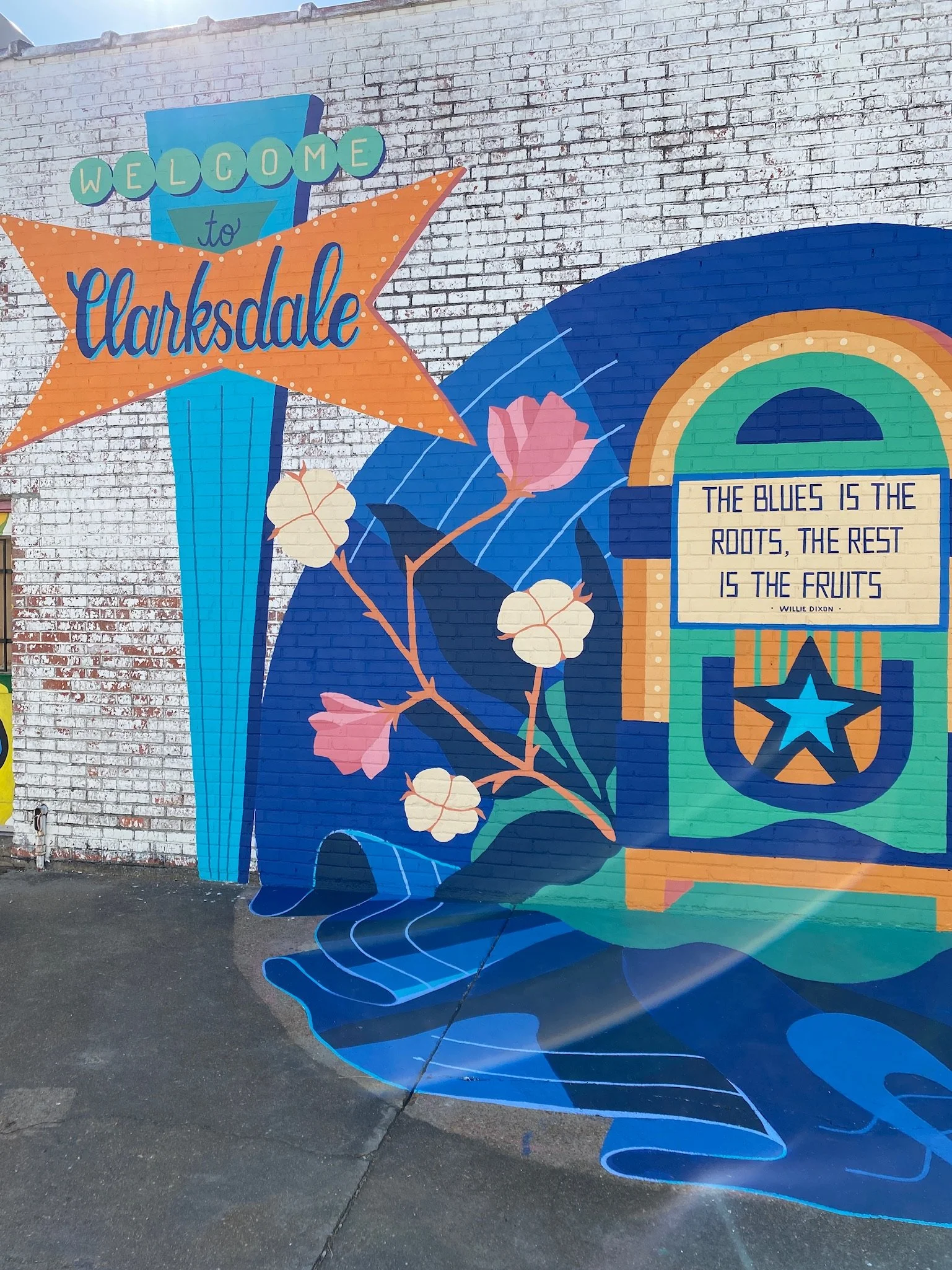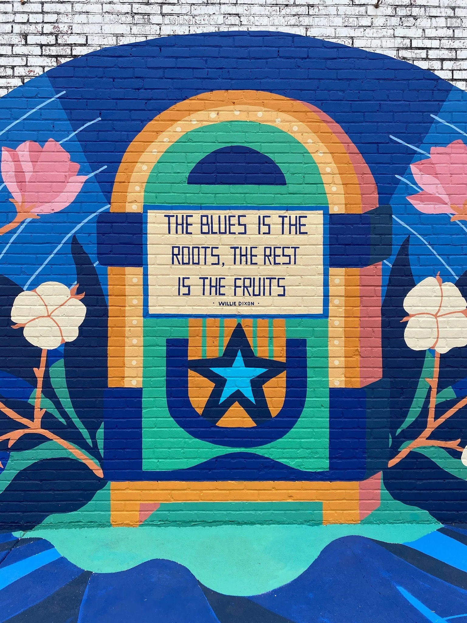 Clarksdale is believed to be the town that created The Blues. For this mural, they chose to feature things that Clarksdale is famous for. Much of Mississippi is farmland that grows and harvests cotton, so they chose to incorporate cotton in multiple stages of its life cycle when it is still a flower blossom and also when it has developed into the cotton we’re all familiar with. The quote on the screen of the jukebox is “The Blues is the roots, the rest is the fruits,” by Willie Dixon. Behind the jukebox is a vinyl record the melts onto the ground in front of the mural, creating a stage-like area that invites viewers to interact with the mural.